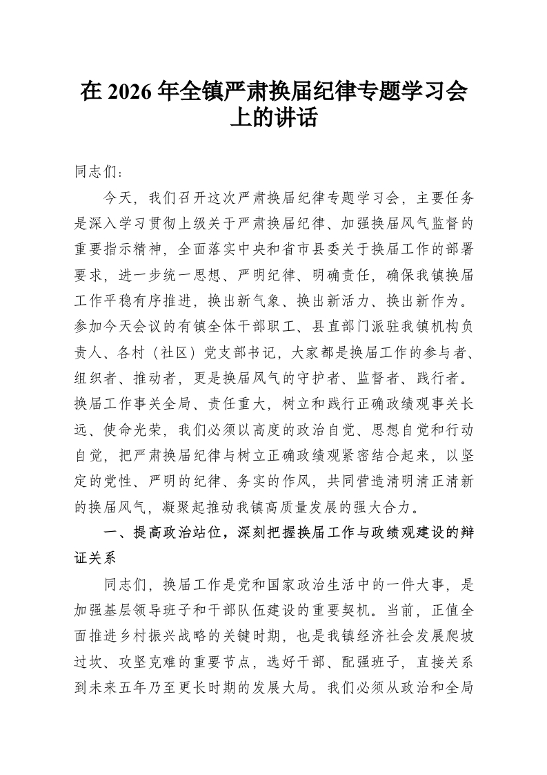 首页讲课讲稿在2026年全镇严肃换届纪律专题学习会上的讲话