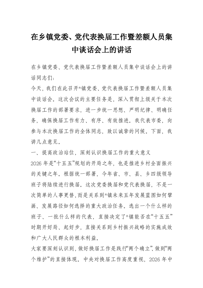 在乡镇党委、党代表换届工作暨差额人员集中谈话会上的讲话
