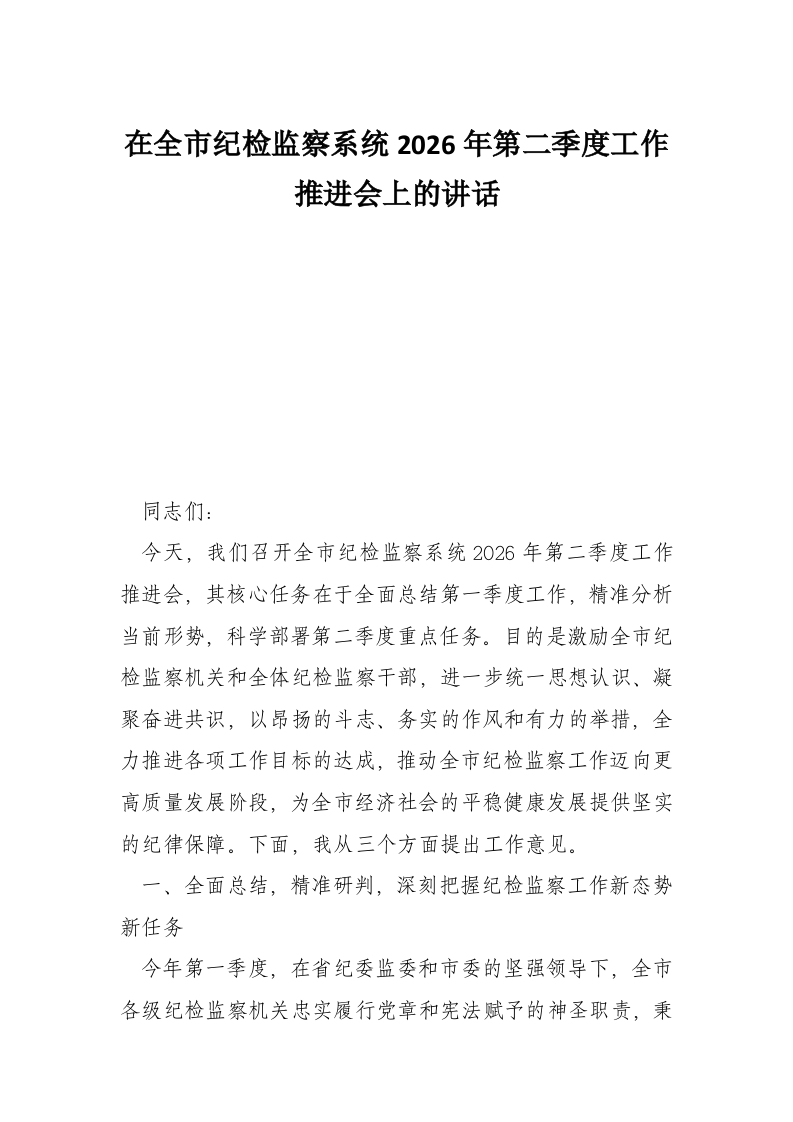 在全市纪检监察系统2026年第二季度工作推进会上的讲话