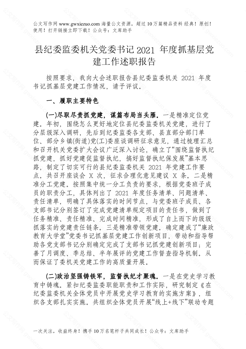 首页讲课讲稿县纪委监委机关党委书记2021年度抓基层党建工作述职报告
