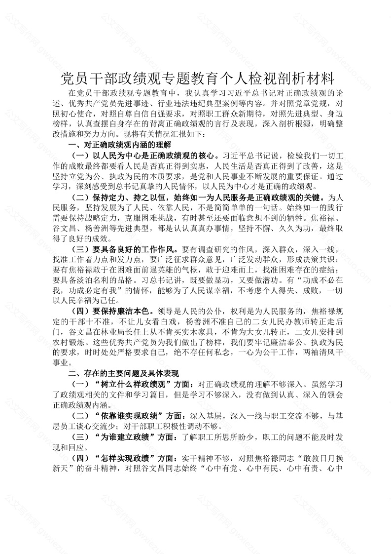 首页工作文档党员干部政绩观专题教育个人检视剖析材料