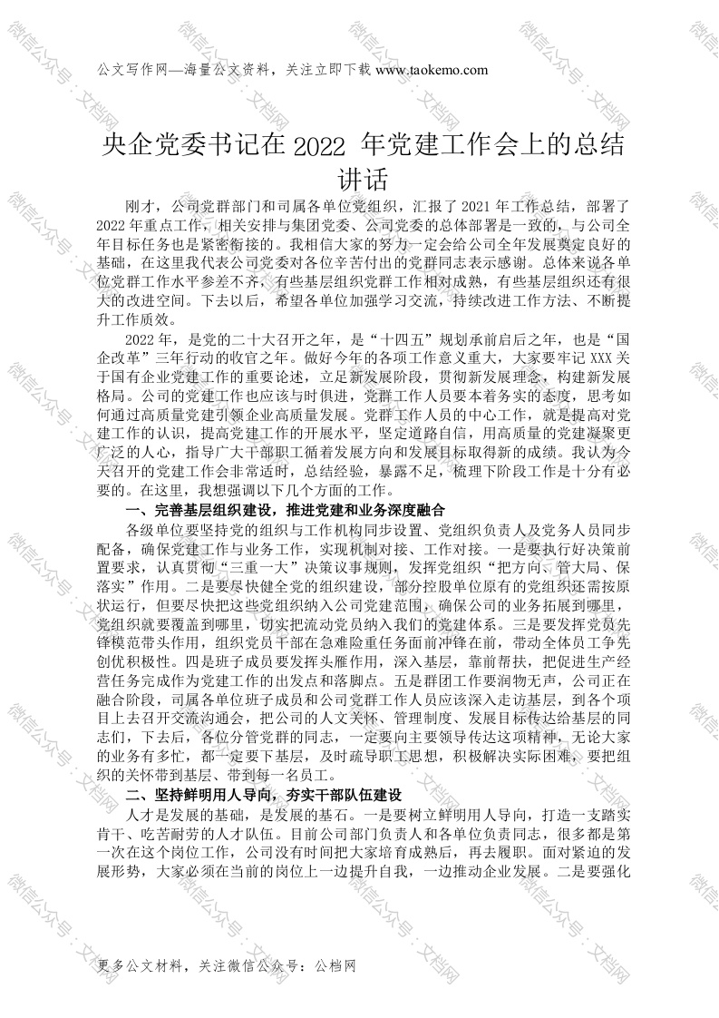 首页工作文档央企党委书记在2022年党建工作会上的总结讲话