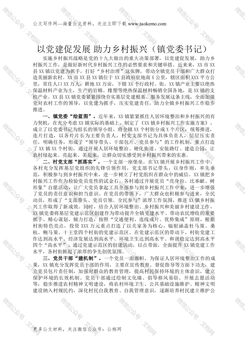 首页工作文档以党建促发展 助力乡村振兴(镇党委书记)