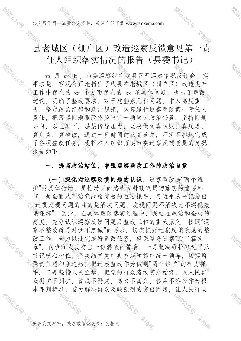 首页材料汇编县老城区(棚户区)改造巡察反馈意见第一责任人组织落实情况的报告(县委书记)