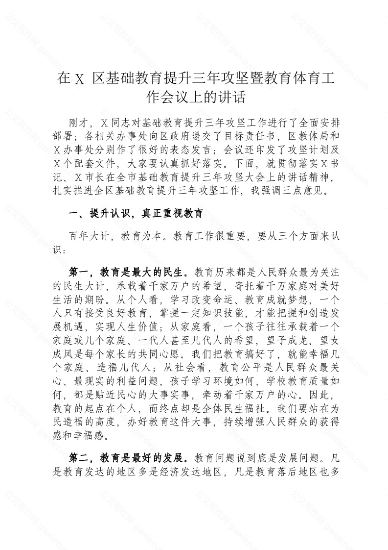 在X区基础教育提升三年攻坚暨教育体育工作会议上的讲话