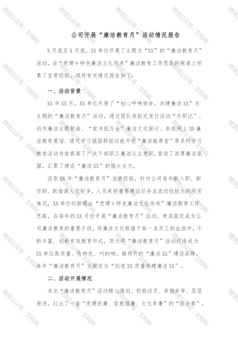 首页精选范文公司开展“廉洁教育月”活动情况报告