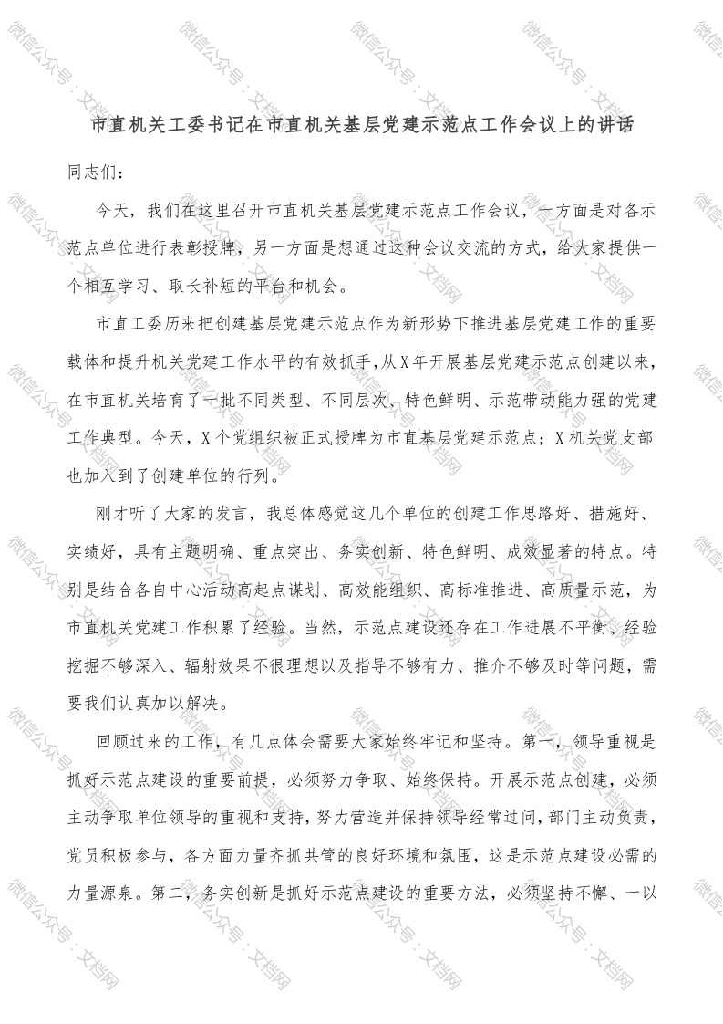 市直机关工委书记在市直机关基层党建示范点工作会议上的讲话