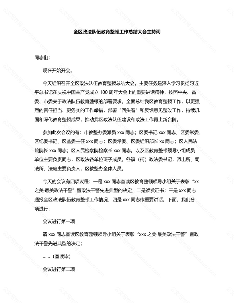 首页工作文档全区政法队伍教育整顿工作总结大会主持词