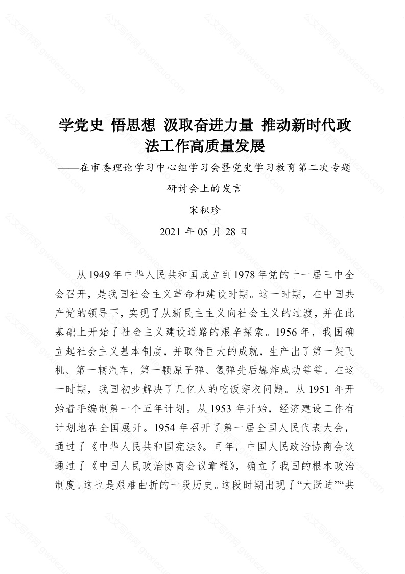 学党史悟思想汲取奋进力量推动新时代政法工作高质量发展——在市委理论学习中心组学习会暨党史学习教育第二次专题研讨会上的发言
