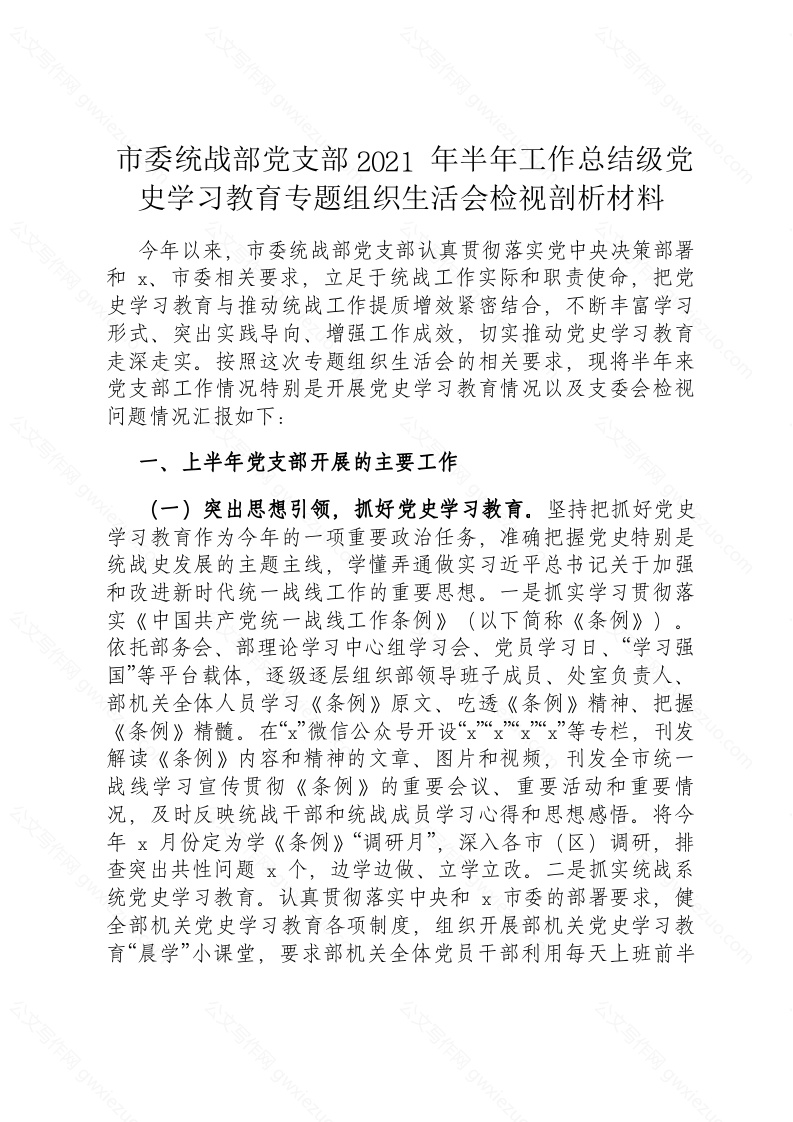 市委统战部党支部2021年半年工作总结级党史学习教育专题组织生活会检视剖析材料