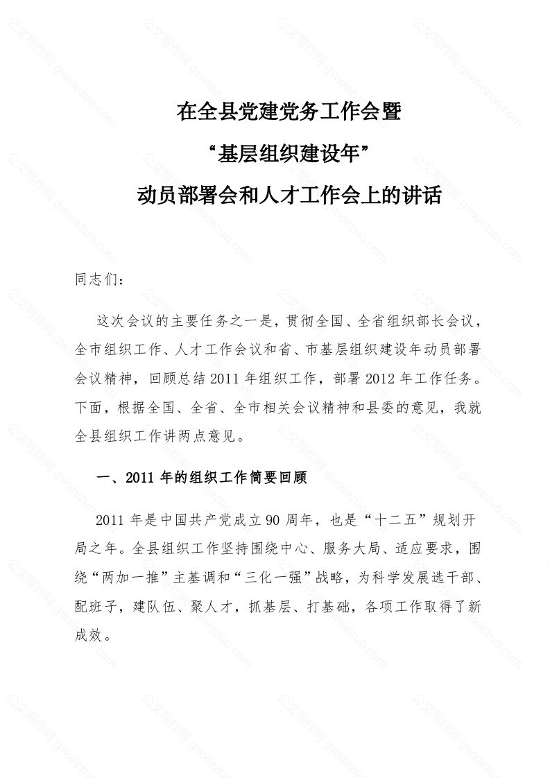 组织部长在全县党建党务工作会暨“基层组织建设年”动员部署会和人才工作会上的讲话