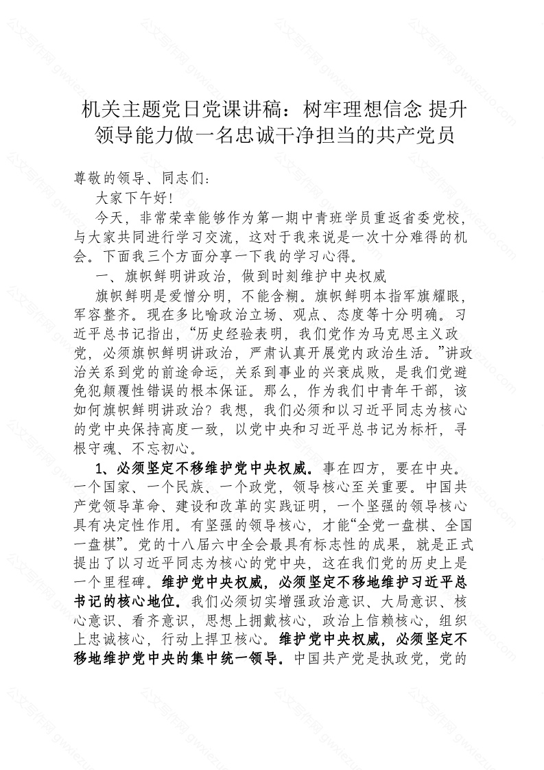 机关主题党日党课讲稿:树牢理想信念 提升领导能力做一名忠诚干净担当的***员