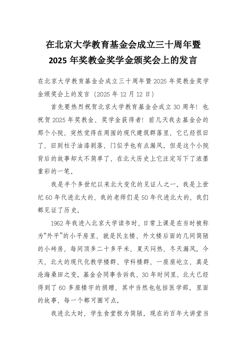 在北京大学教育基金会成立三十周年暨2025年奖教金奖学金颁奖会上的发言