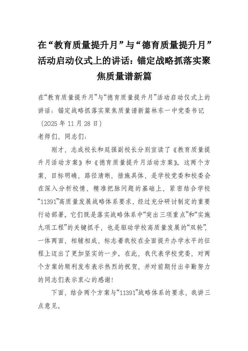 在“教育质量提升月”与“德育质量提升月”活动启动仪式上的讲话:锚定战略抓落实聚焦质量谱新篇
