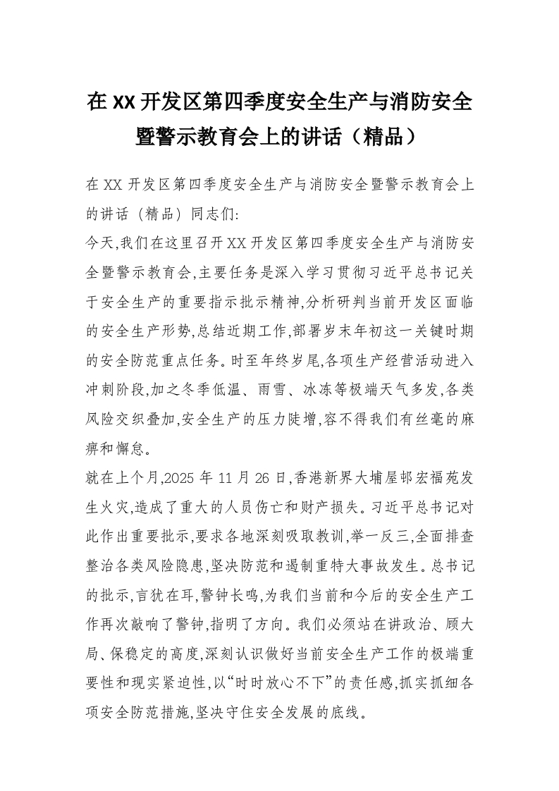 在XX开发区第四季度安全生产与消防安全暨警示教育会上的讲话(精品)