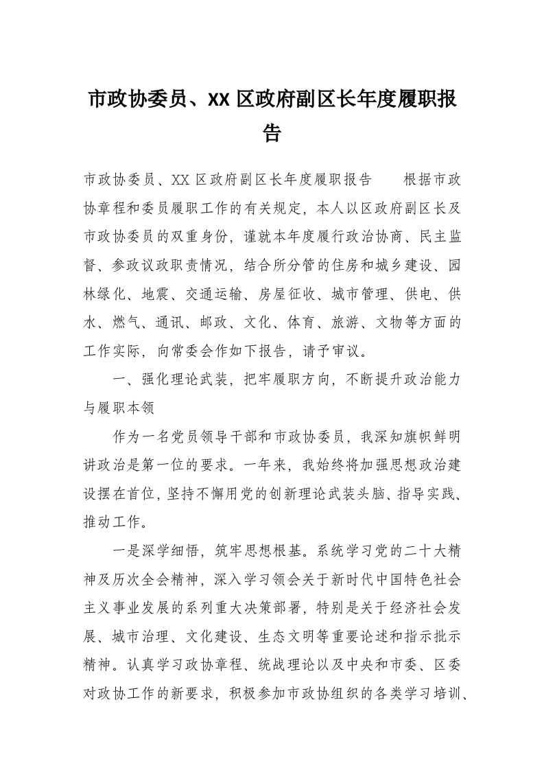 市政协委员、XX区***副区长年度履职报告