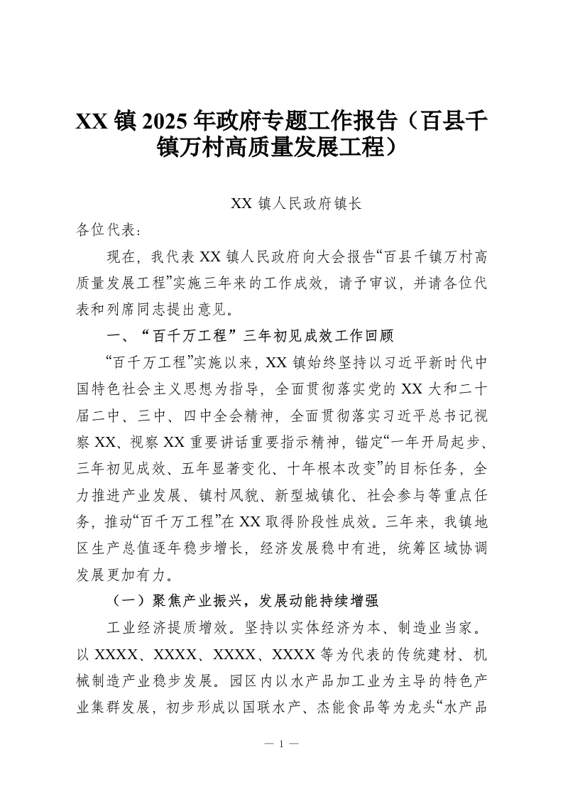 XX镇2025年***专题工作报告(百县千镇万村高质量发展工程)