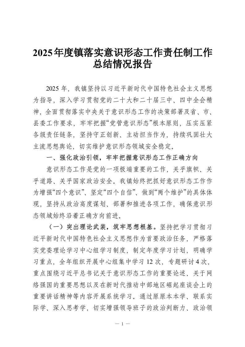2025年度镇落实意识形态工作责任制工作总结情况报告