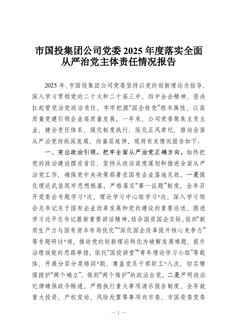 首页精选范文市国投集团公司党委2025年度落实全面从严治党主体责任情况报告