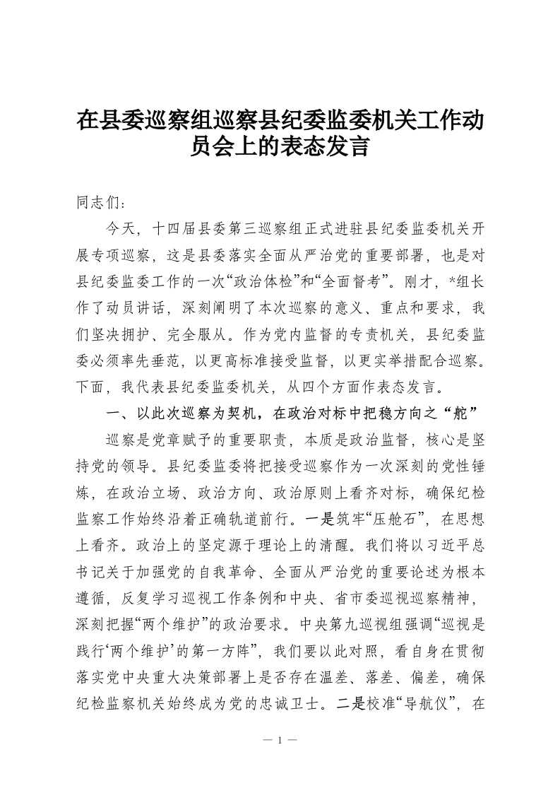 在县委巡察组巡察县纪委监委机关工作动员会上的表态发言