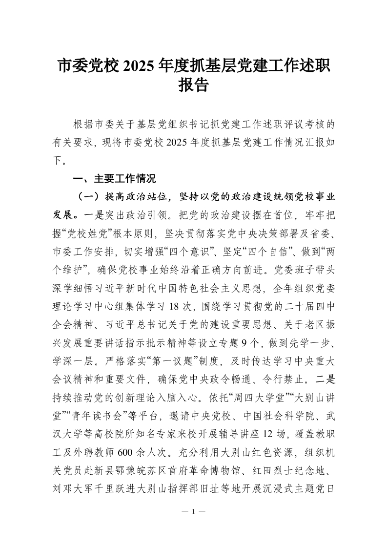首页讲课讲稿市委党校2025年度抓基层党建工作述职报告