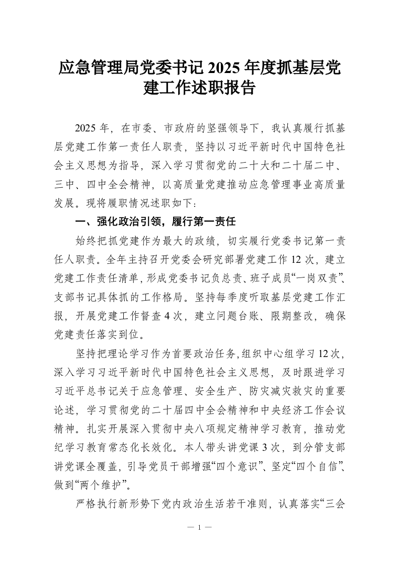 应急管理局党委书记2025年度抓基层党建工作述职报告