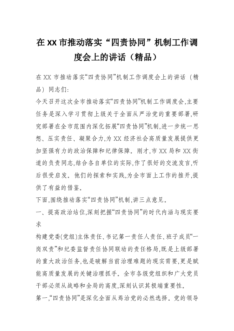 在XX市推动落实“四责协同”机制工作调度会上的讲话(精品)