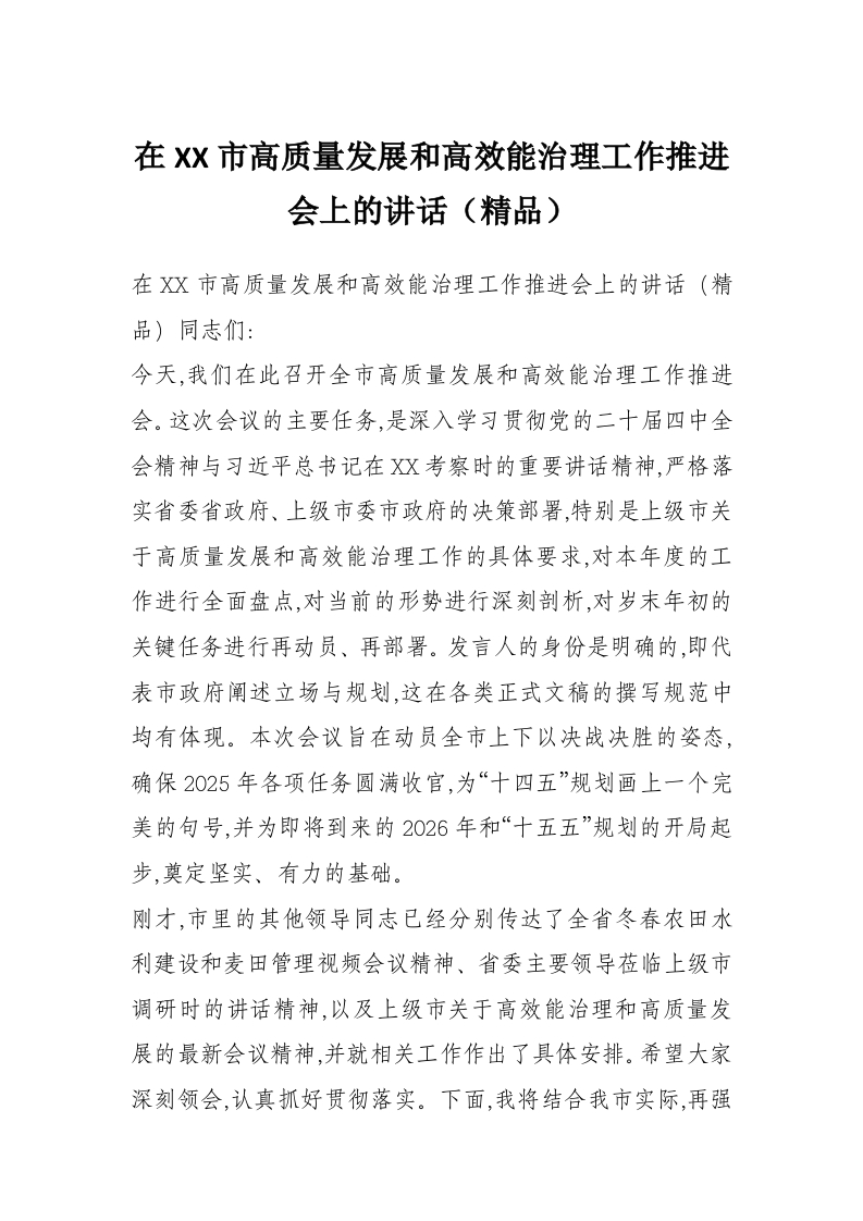 在XX市高质量发展和高效能治理工作推进会上的讲话(精品)