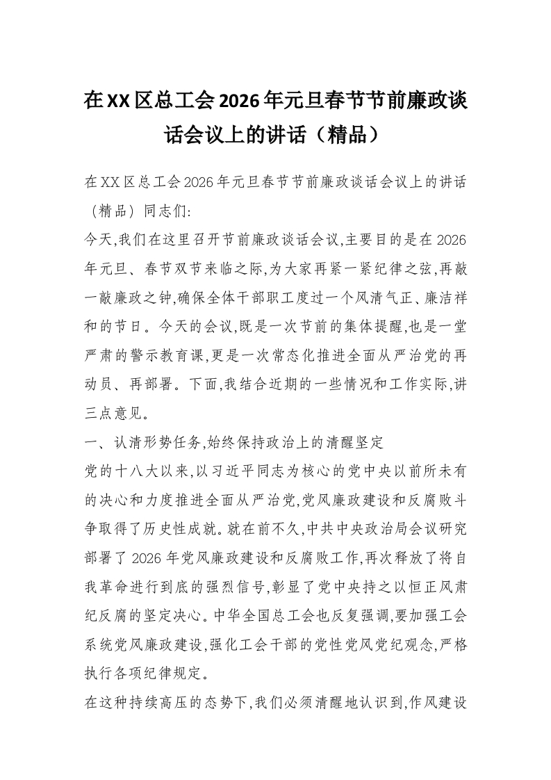 在XX区总工会2026年元旦春节节前廉政谈话会议上的讲话(精品)