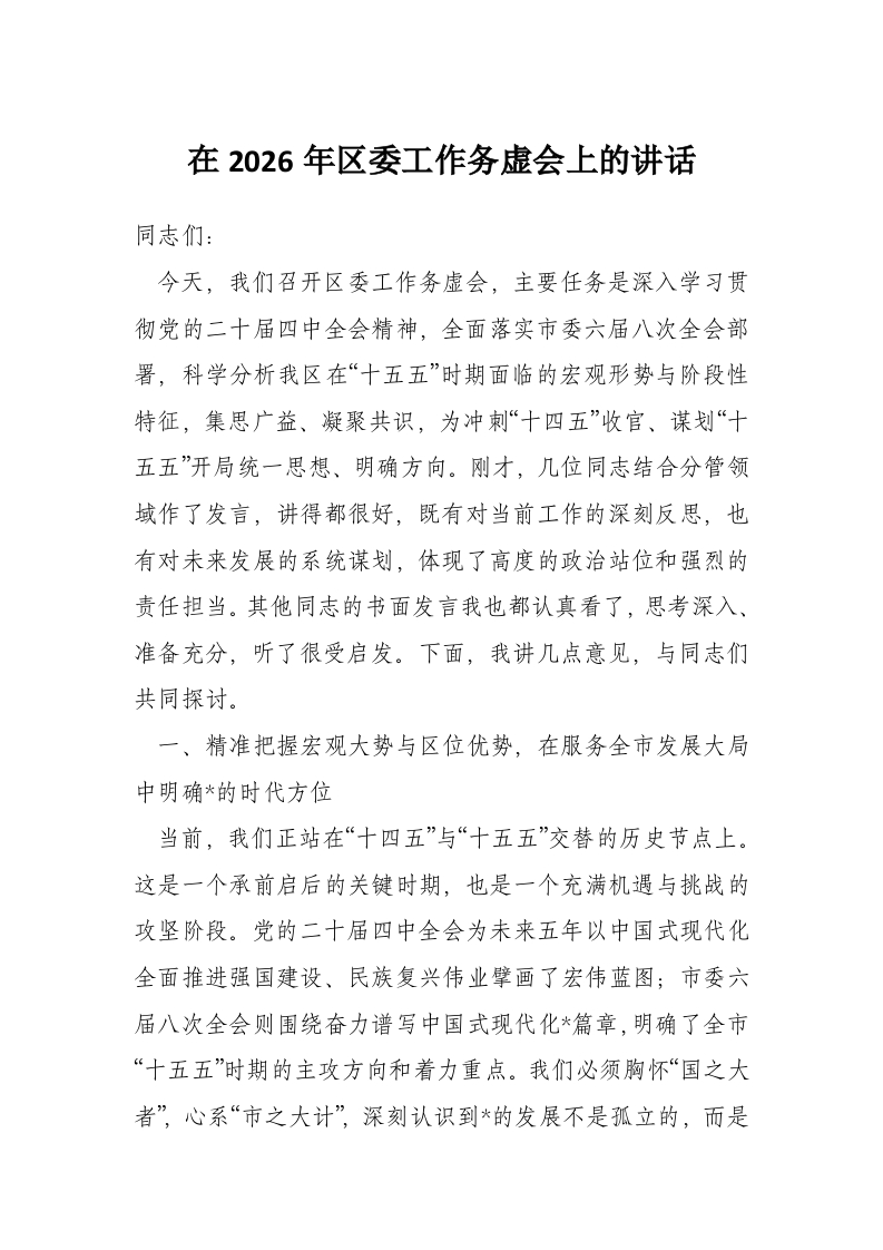 在2026年区委工作务虚会上的讲话