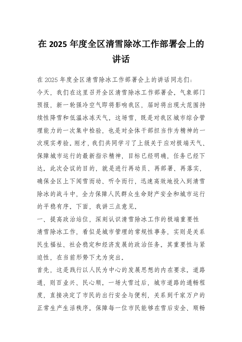 在2025年度全区清雪除冰工作部署会上的讲话