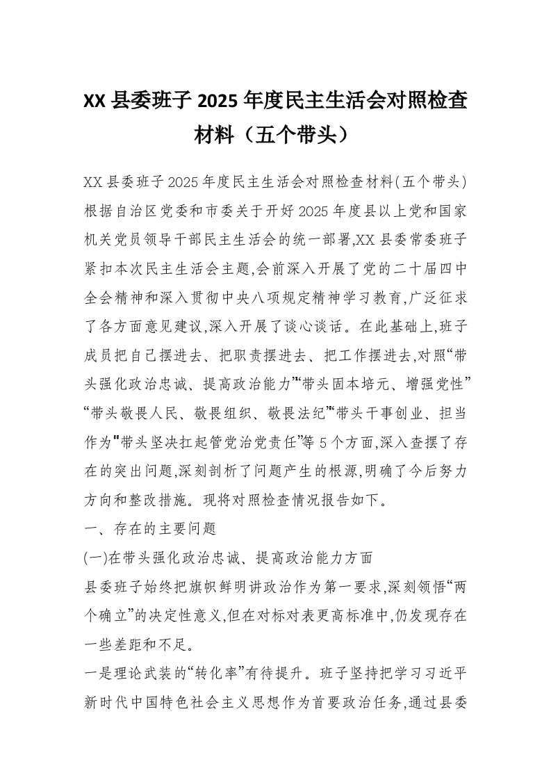 XX县委班子2025年度民主生活会对照检查材料(五个带头)