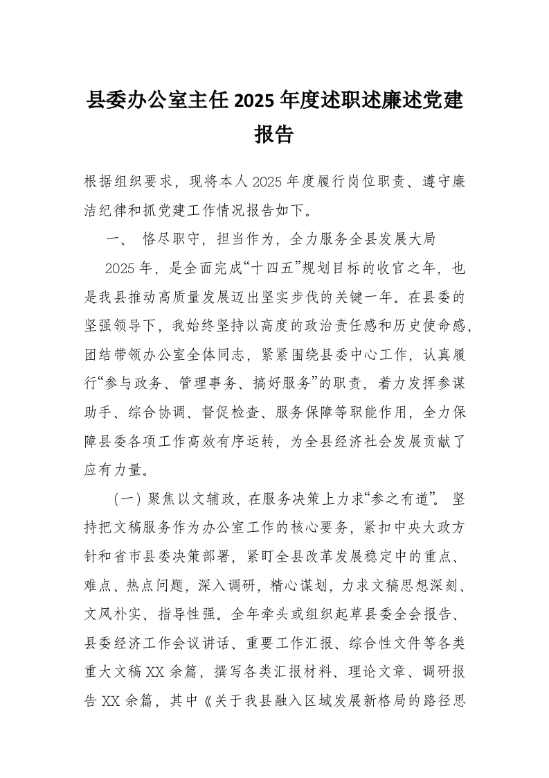首页工作文档县委办公室主任2025年度述职述廉述党建报告