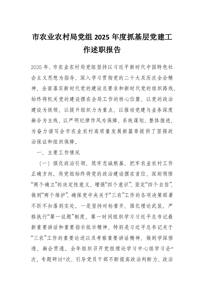 市农业农村局党组2025年度抓基层党建工作述职报告