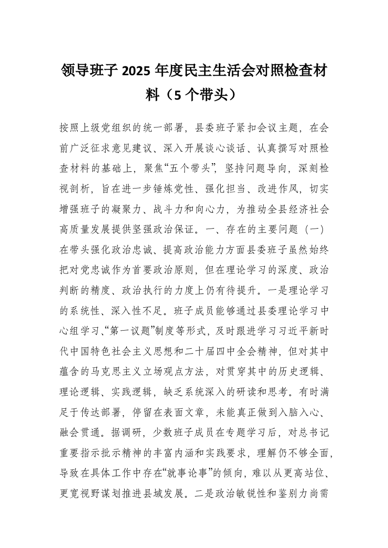领导班子2025年度民主生活会对照检查材料(5个带头)