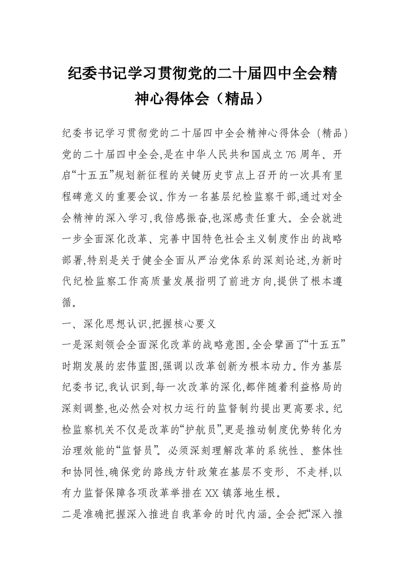 首页工作文档纪委书记学习贯彻党的二十届四中***精神心得体会(精品)