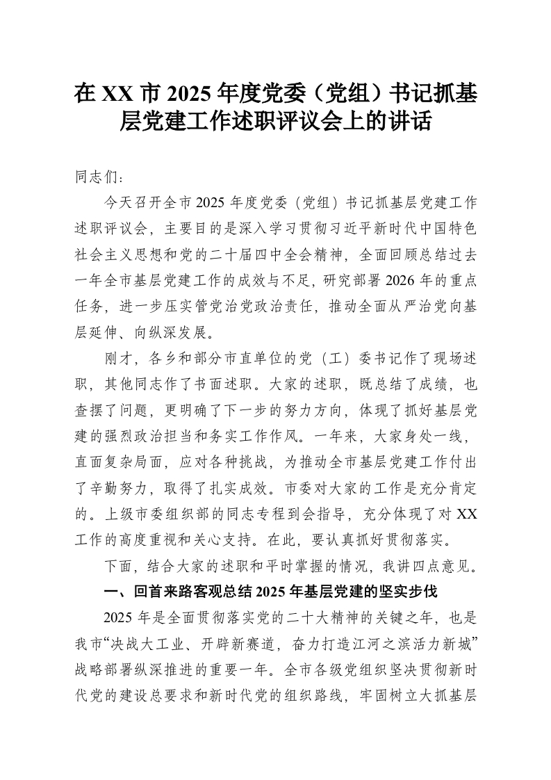 在XX市2025年度党委(党组)书记抓基层党建工作述职评议会上的讲话