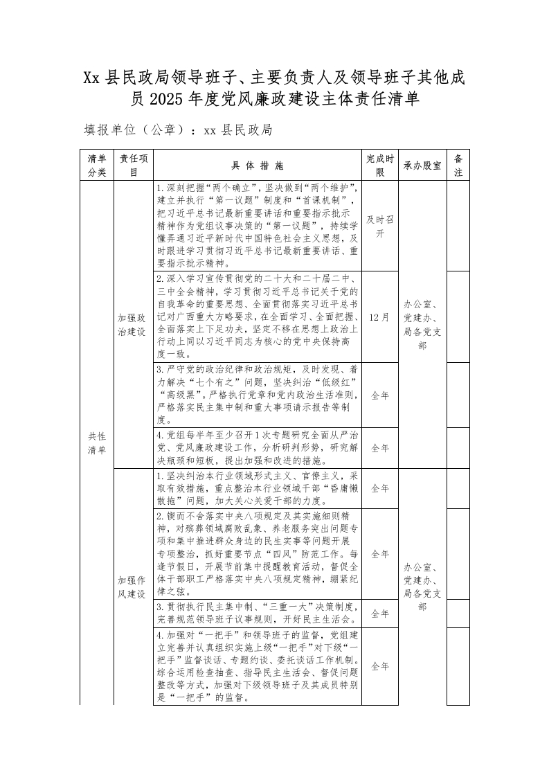Xx县民政局领导班子、主要负责人及领导班子其他成员2025年度党风廉政建设主体责任清单