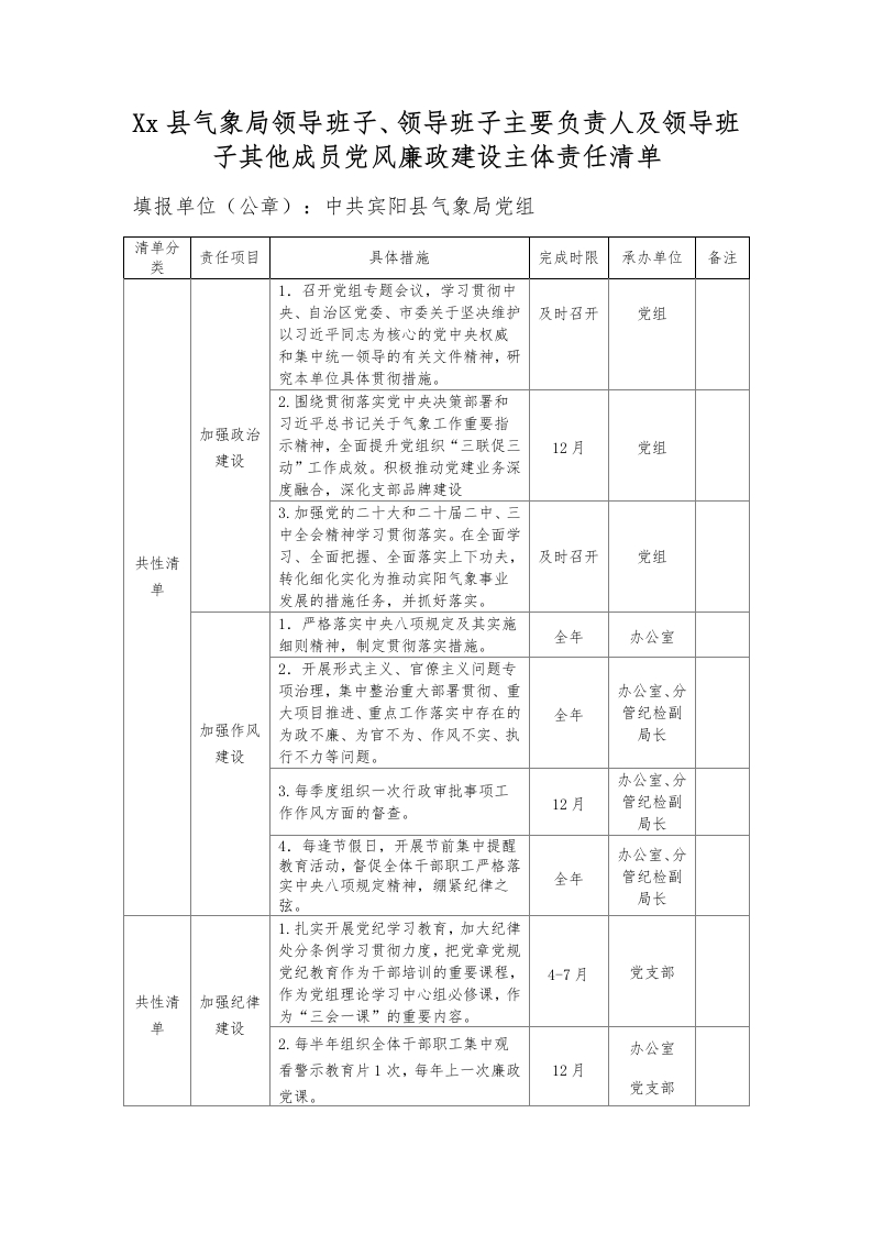 Xx县气象局领导班子、领导班子主要负责人及领导班子其他成员党风廉政建设主体责任清单