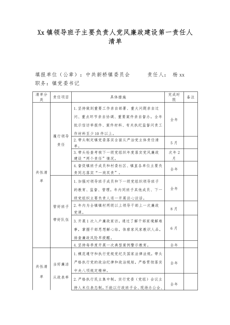 首页办公表格Xx镇领导班子主要负责人党风廉政建设第一责任人清单