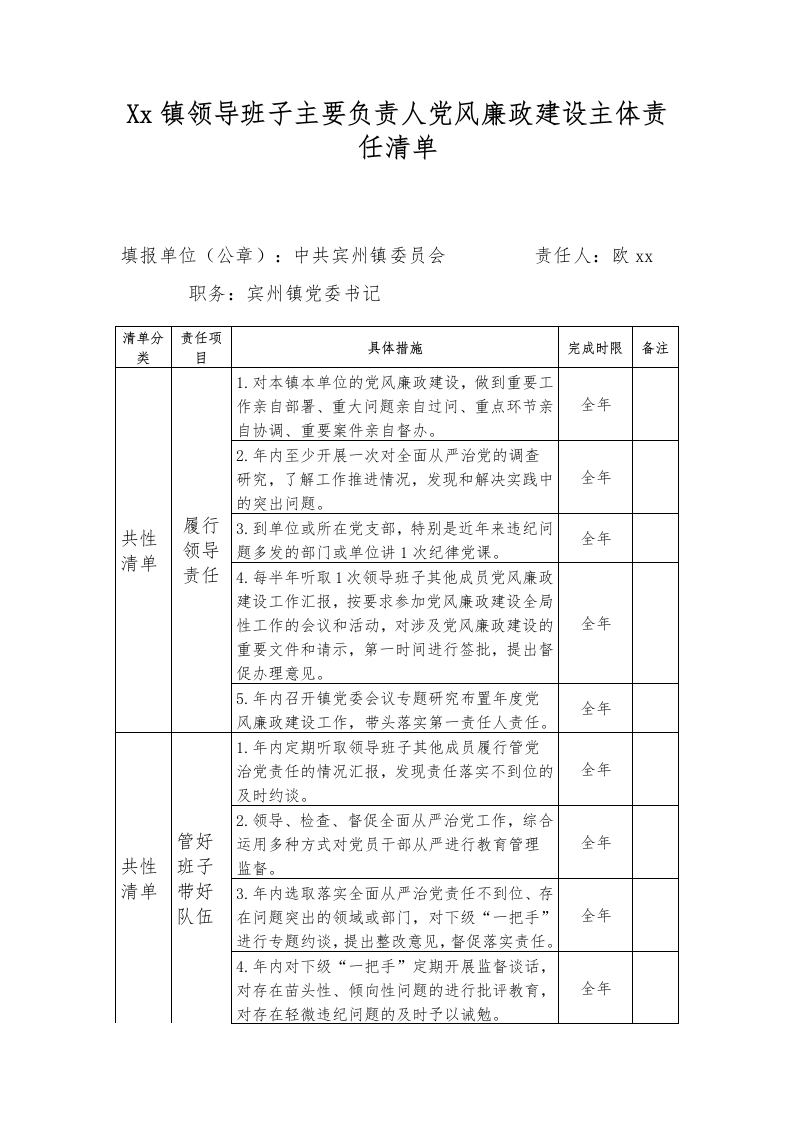 首页办公表格Xx镇领导班子主要负责人党风廉政建设主体责任清单