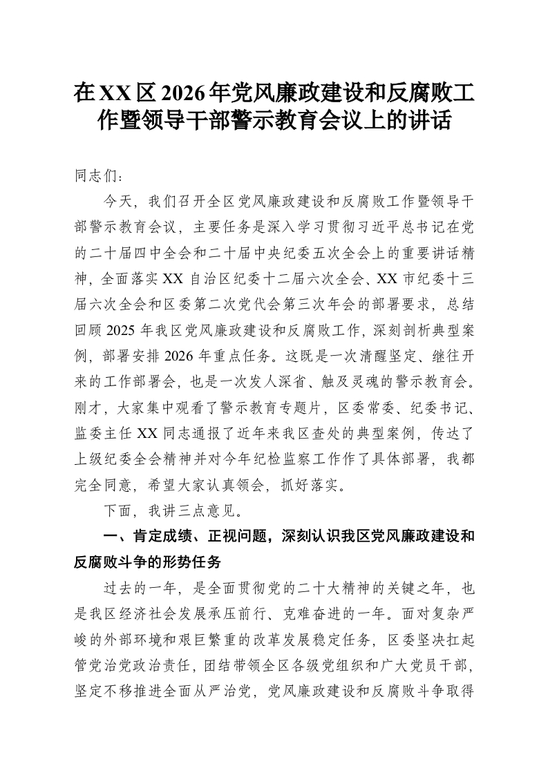 在XX区2026年党风廉政建设和反腐败工作暨领导干部警示教育会议上的讲话