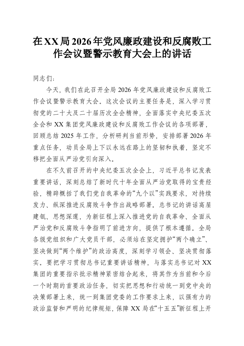 在XX局2026年党风廉政建设和反腐败工作会议暨警示教育大会上的讲话