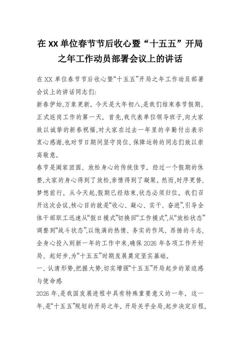 在XX单位春节节后收心暨“十五五”开局之年工作动员部署会议上的讲话