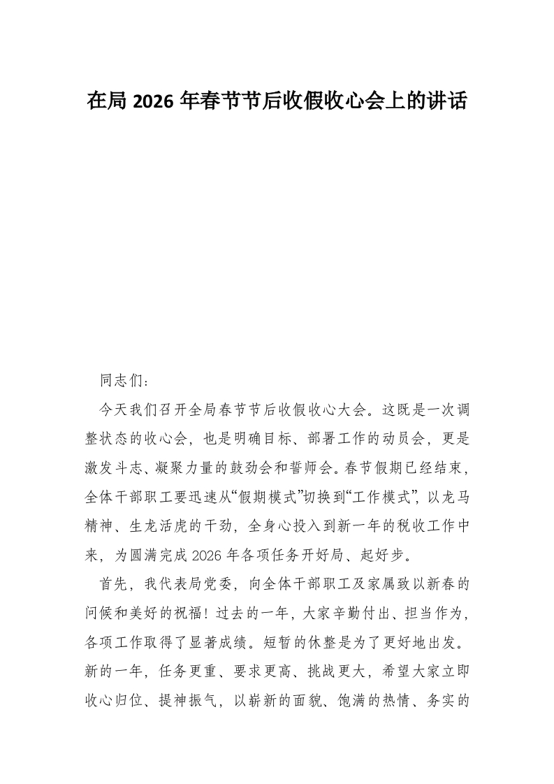 在局2026年春节节后收假收心会上的讲话