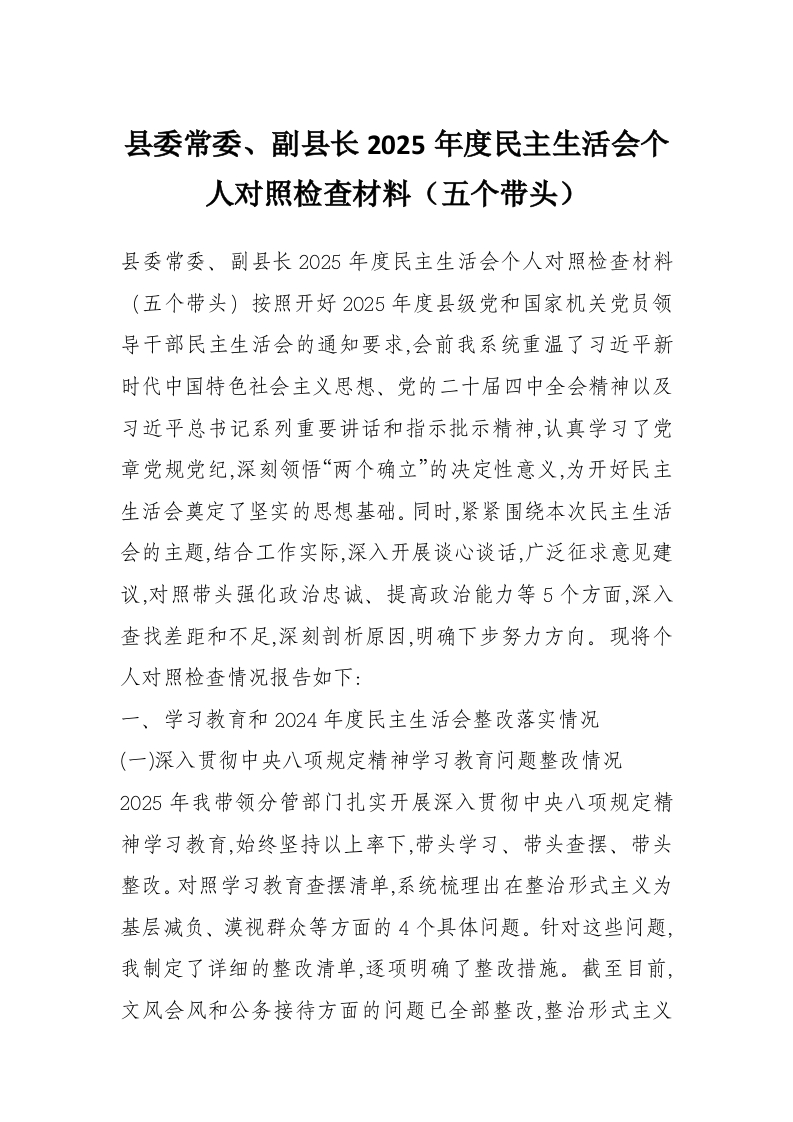 首页精选范文县委常委、副县长2025年度民主生活会个人对照检查材料(五个带头)