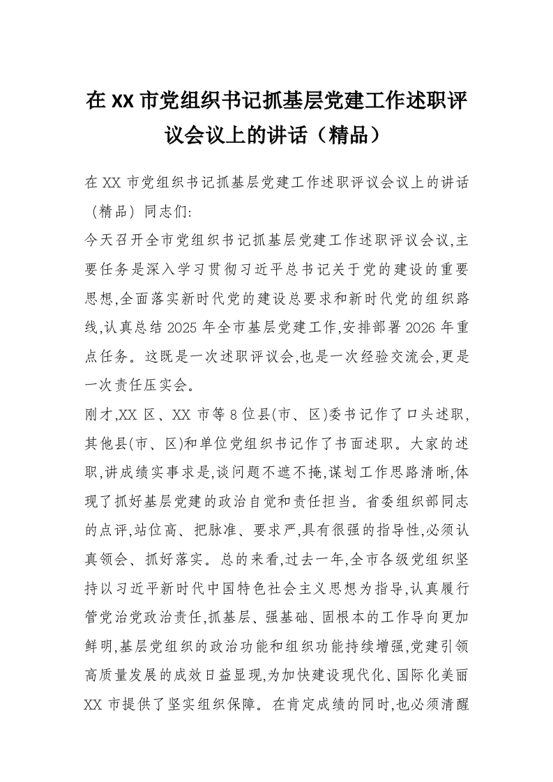 在XX市党组织书记抓基层党建工作述职评议会议上的讲话(精品)
