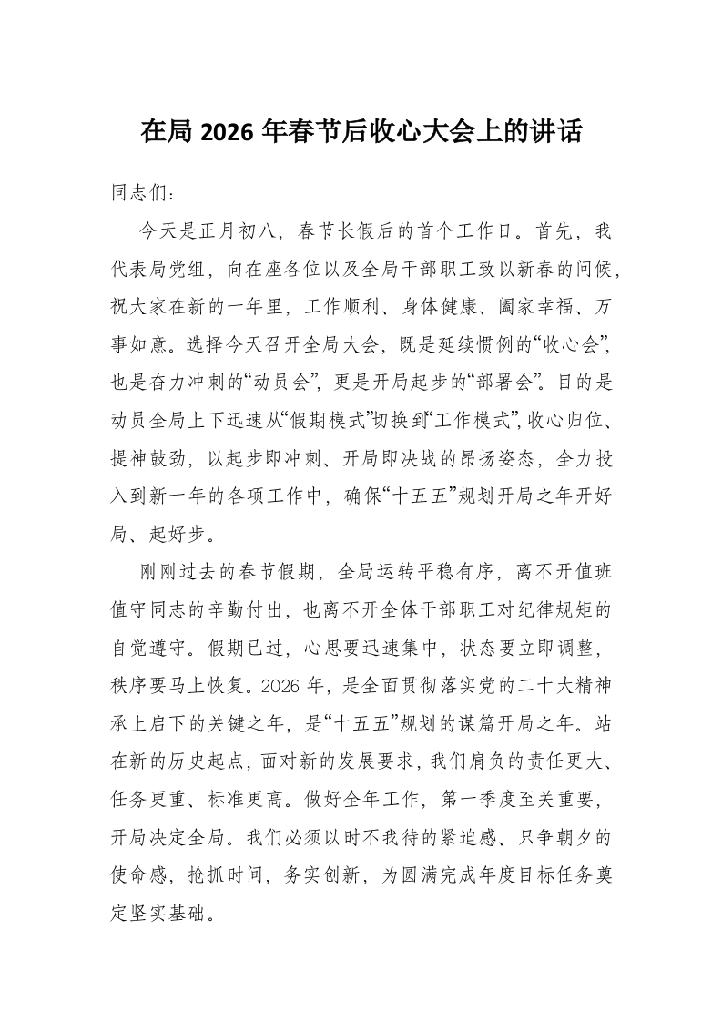 在局2026年春节后收心大会上的讲话