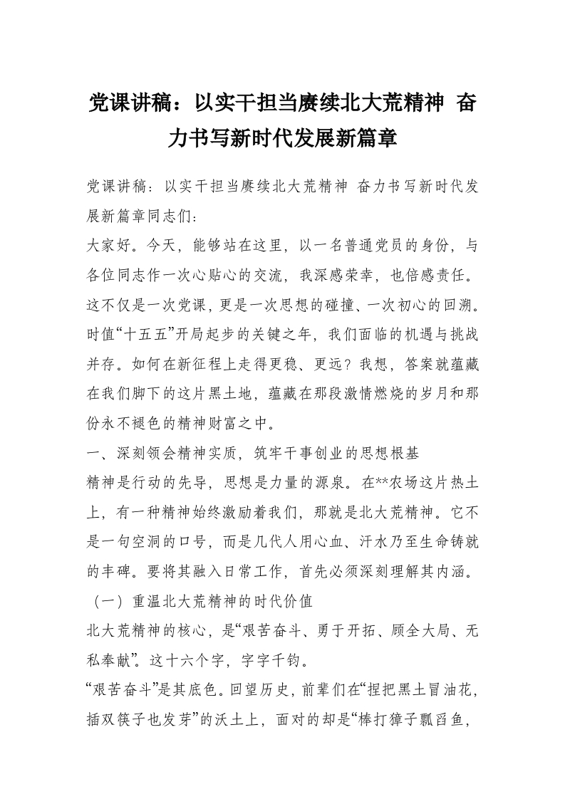 党课讲稿:以实干担当赓续北大荒精神 奋力书写新时代发展新篇章