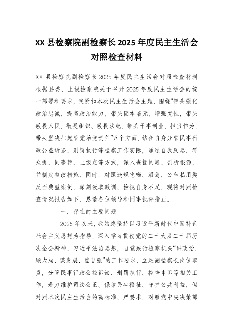 XX县检察院副检察长2025年度民主生活会对照检查材料
